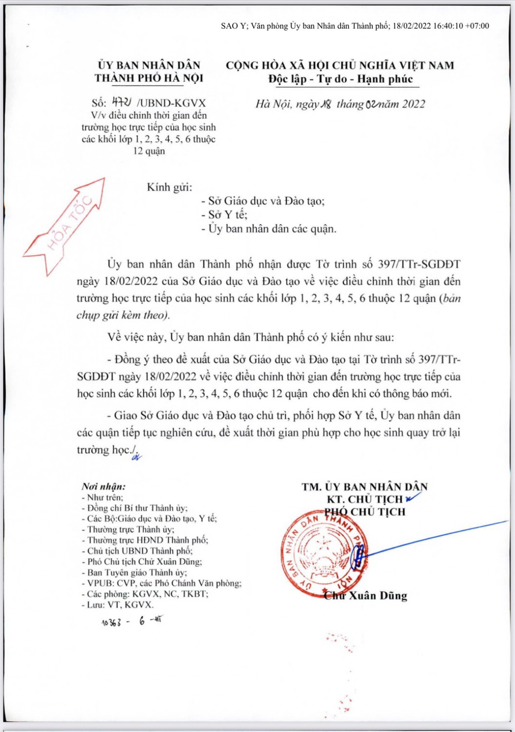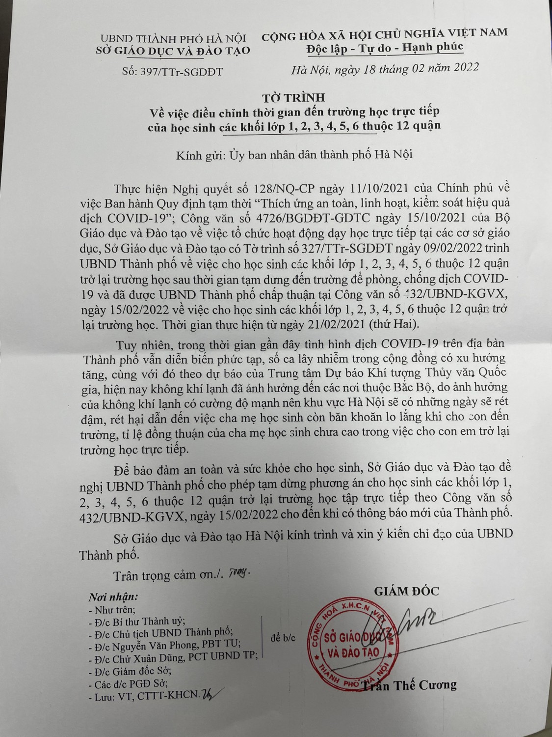 Trường Tiểu học Trần Quốc Toản: Kính gửi Quý phụ huynh, các cán bộ, giáo viên, nhân viên và học sinh công văn của UBND Thành phố Hà Nội về việc điều chỉnh thời gian đến trường học tập trực tiếp của học sinh. Các con tiếp tục học trực tuyến theo lịch cũ cho đến khi có thông báo mới.