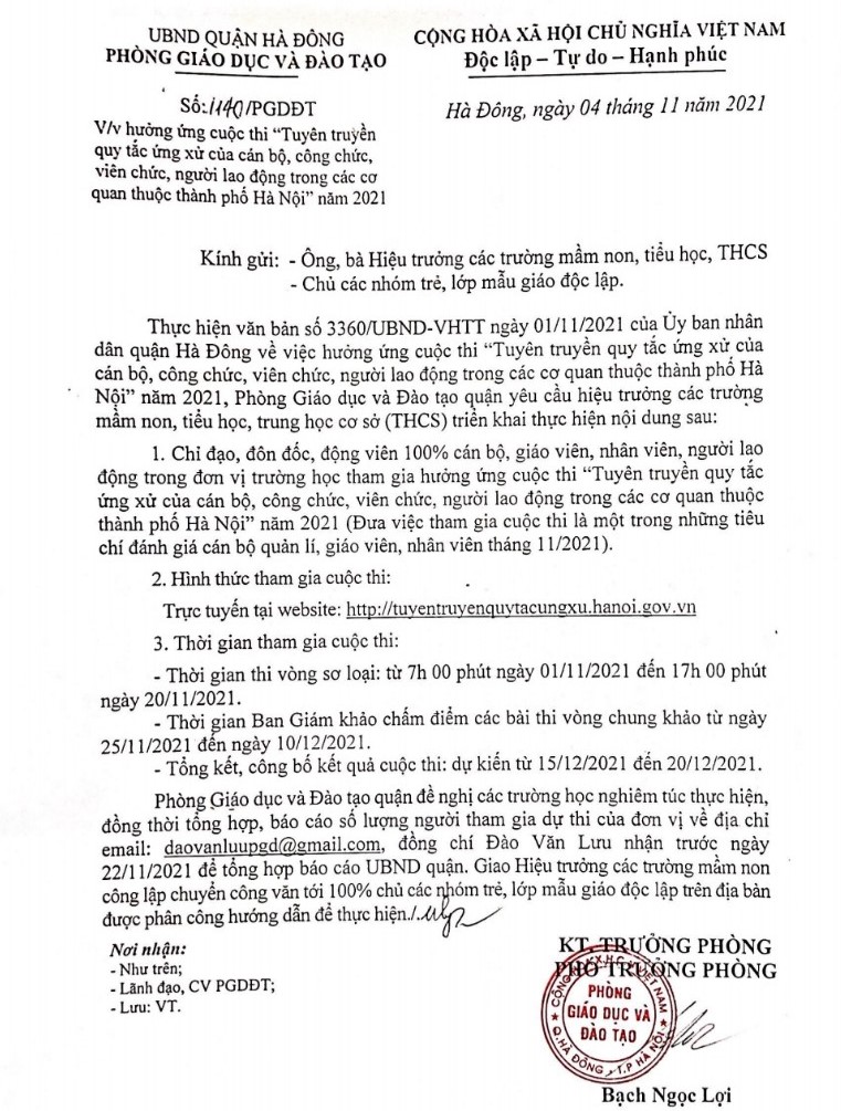 Thực hiện Công văn số 1140/PGDĐT ngày 04/11/2021 của phòng GD&ĐT quận Hà Đông về việc hưởng ứng cuộc thi "Tuyên truyền quy tắc ứng xử của cán bộ, công chức, viên chức, người lao động trong các cơ quan thuộc thành phố Hà Nội" năm 2021. Trường TH Trần Quốc Toản đã phát động đến cán bộ, giáo viên, nhân viên nhà trường và được sự hưởng ứng 100% cán bộ, giáo viên, nhân viên nhà trường tham gia.