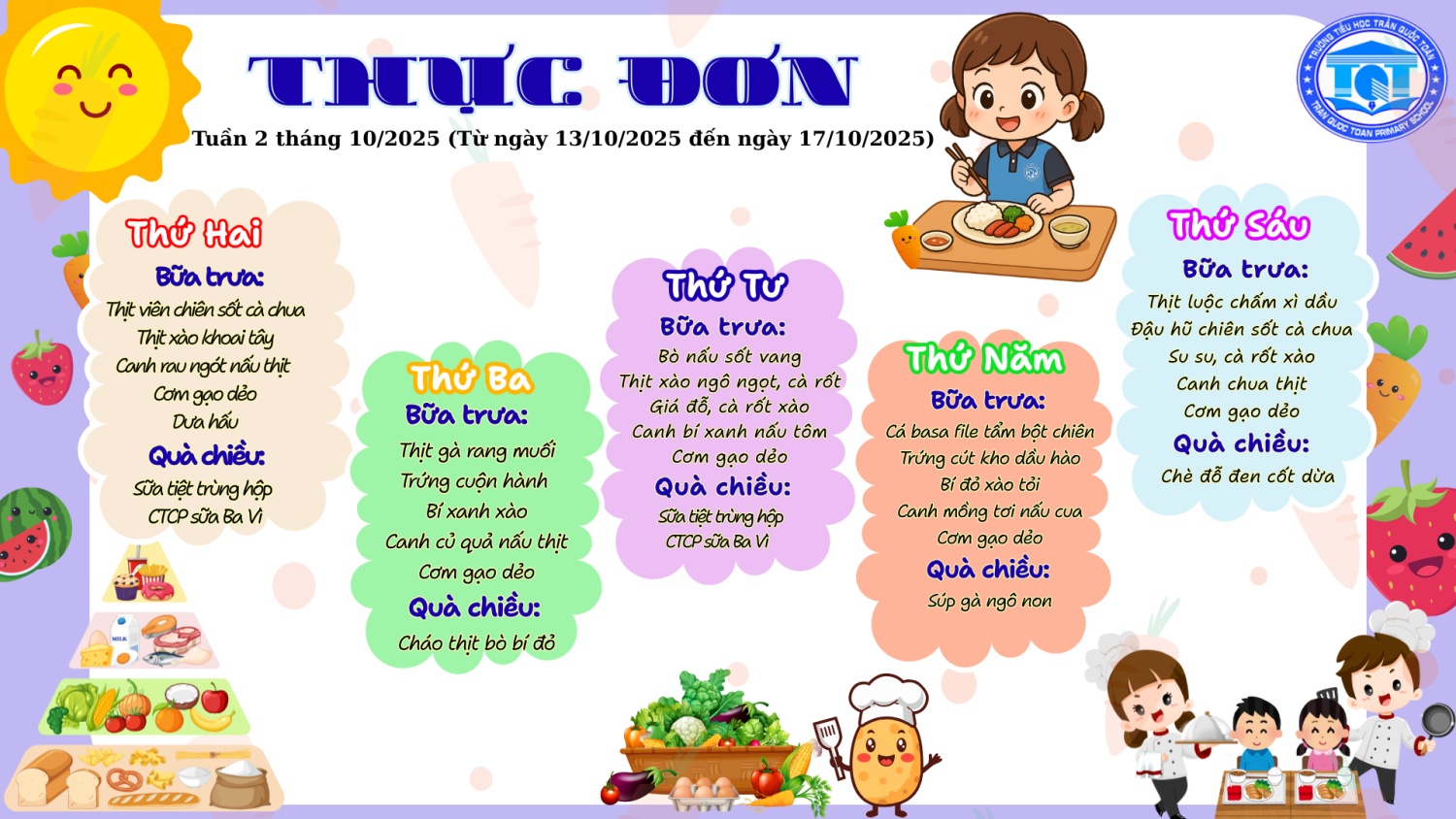 Thực đơn bán trú tuần 2 tháng 10 (từ ngày 13/10 đến ngày 17/10)