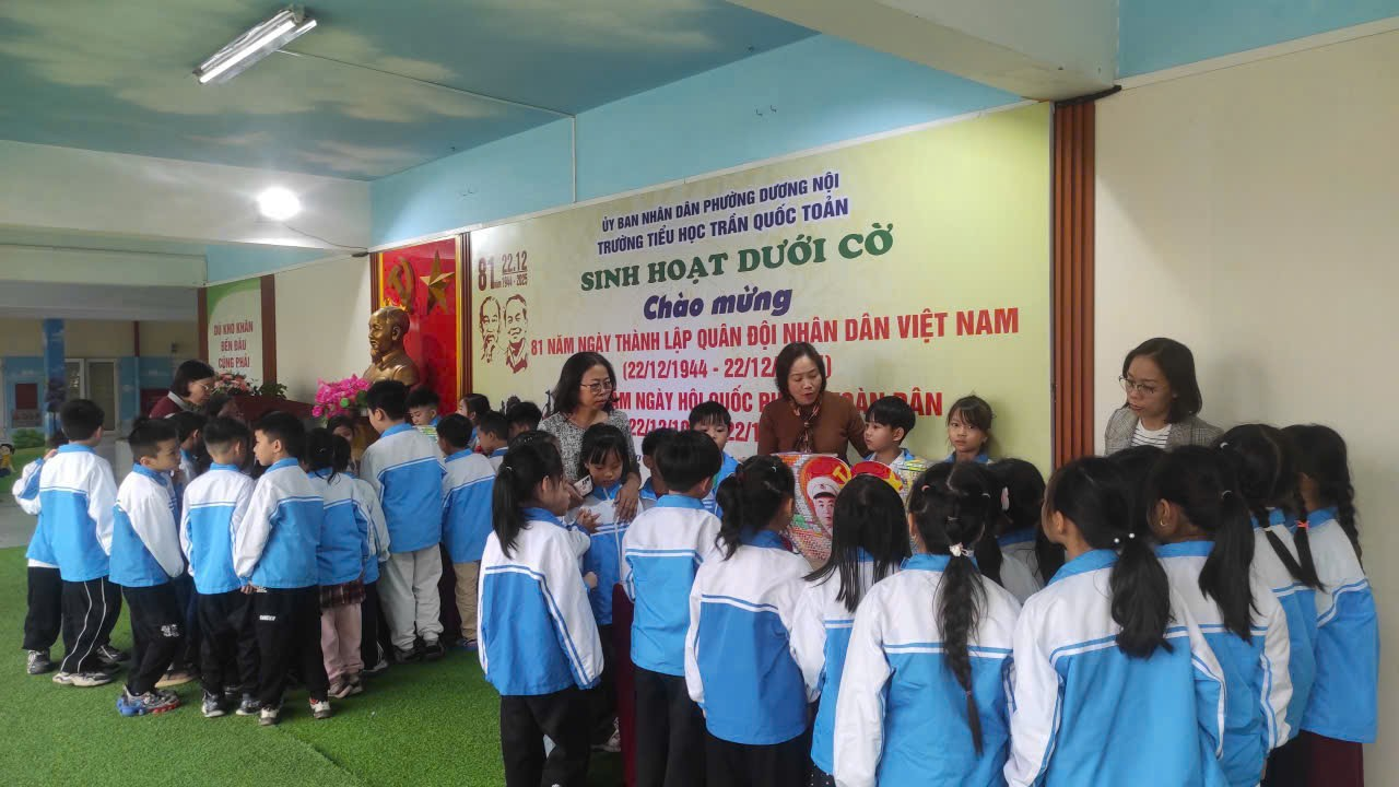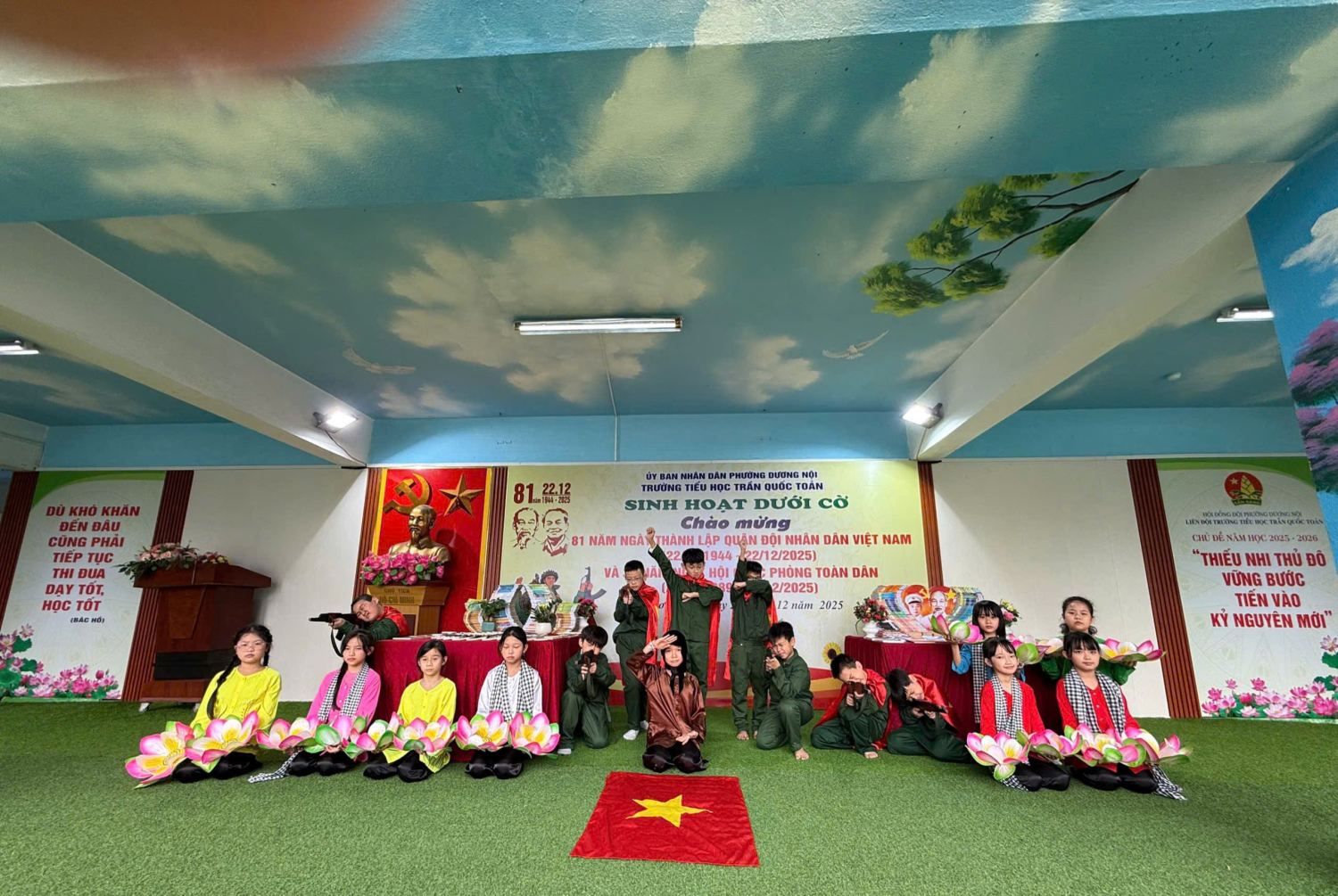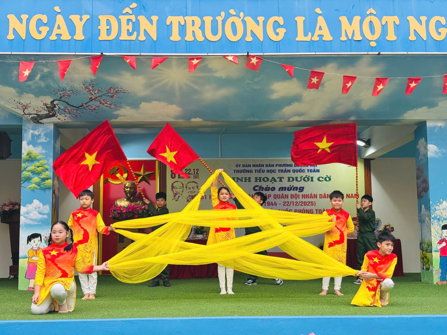Tháng Mười Hai khẽ về, sân trường như lắng lại trong sắc cờ đỏ thắm. Giữa không khí trang nghiêm mà ấm áp ấy, ngày 22/12 hiện lên như một dấu mốc thiêng liêng, nhắc nhớ về Quân đội nhân dân Việt Nam – lực lượng được sinh ra từ Nhân dân, vì Nhân dân và vì Tổ quốc. Hướng về ngày ý nghĩa này, sáng 22/12/2025, Liên đội Trường Tiểu học Trần Quốc Toản đã tổ chức chương trình sinh hoạt dưới cờ chào mừng Ngày thành lập Quân đội nhân dân Việt Nam và Ngày hội Quốc phòng toàn dân.