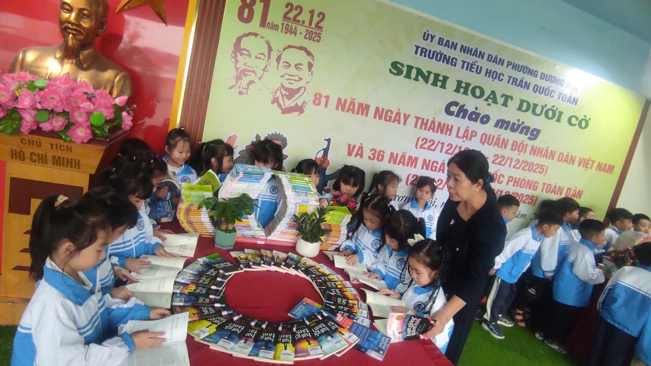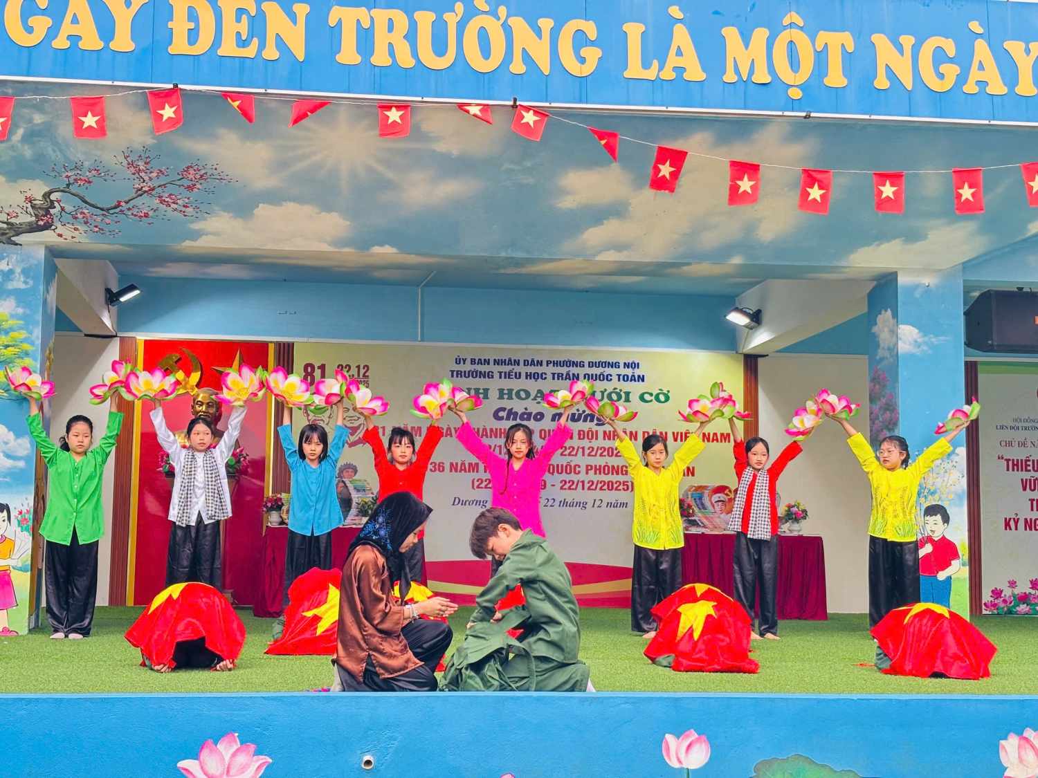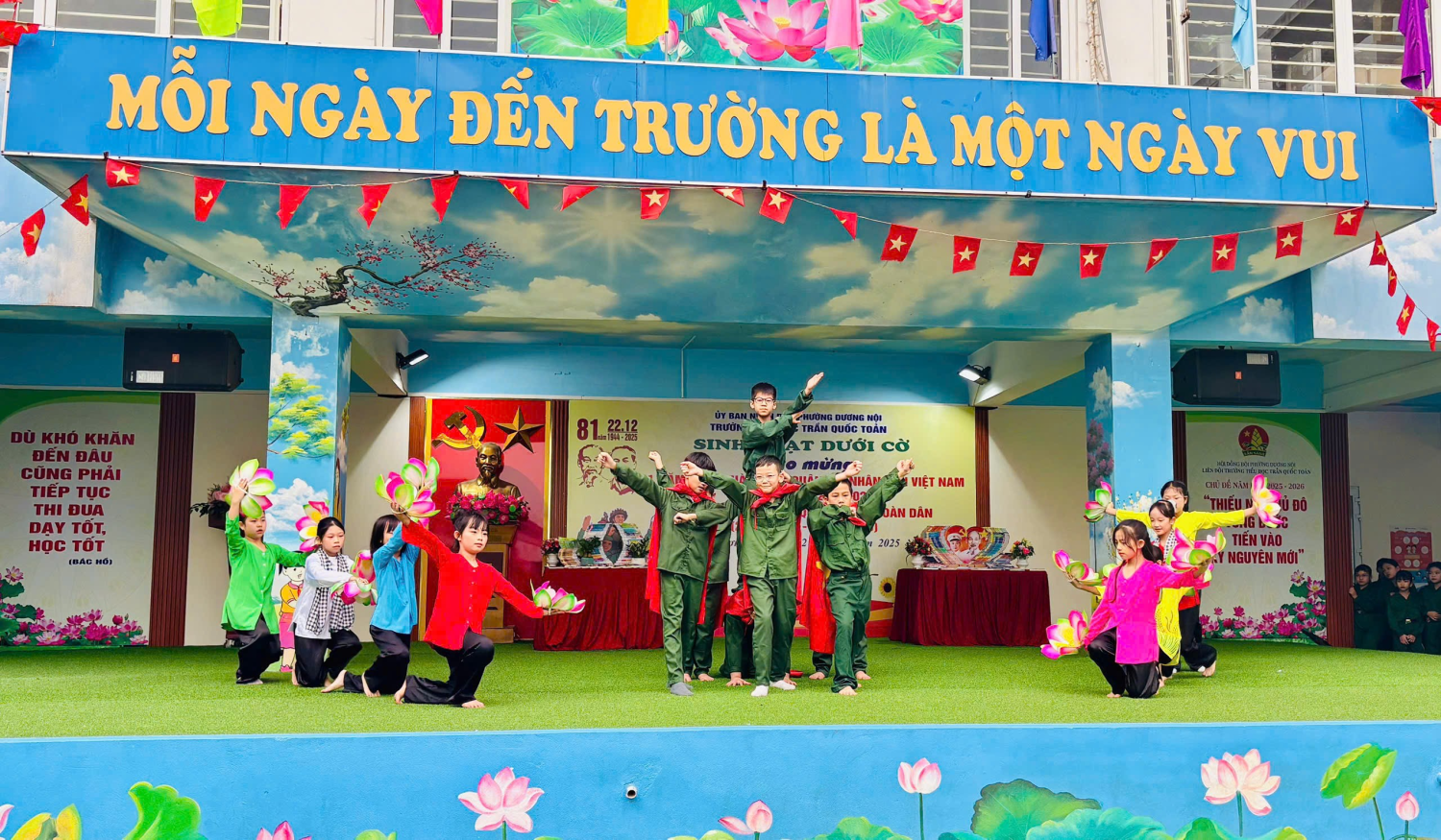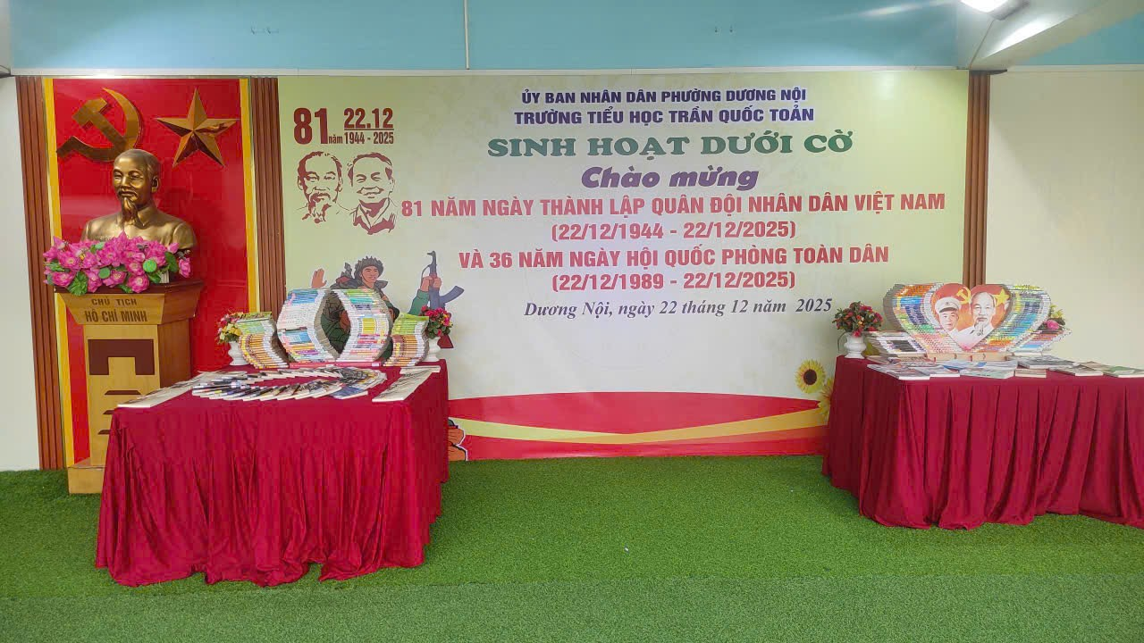 Tháng Mười Hai khẽ về, sân trường như lắng lại trong sắc cờ đỏ thắm. Giữa không khí trang nghiêm mà ấm áp ấy, ngày 22/12 hiện lên như một dấu mốc thiêng liêng, nhắc nhớ về Quân đội nhân dân Việt Nam – lực lượng được sinh ra từ Nhân dân, vì Nhân dân và vì Tổ quốc. Hướng về ngày ý nghĩa này, sáng 22/12/2025, Liên đội Trường Tiểu học Trần Quốc Toản đã tổ chức chương trình sinh hoạt dưới cờ chào mừng Ngày thành lập Quân đội nhân dân Việt Nam và Ngày hội Quốc phòng toàn dân.